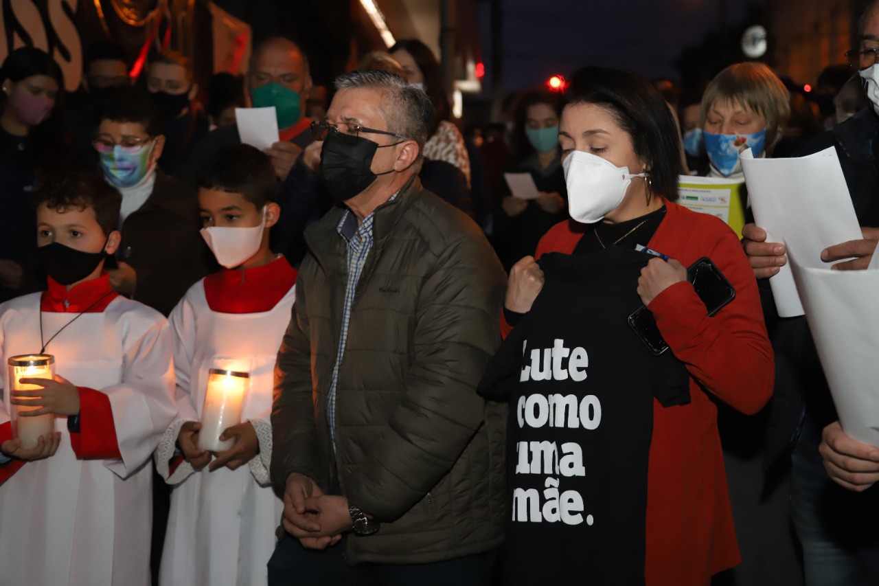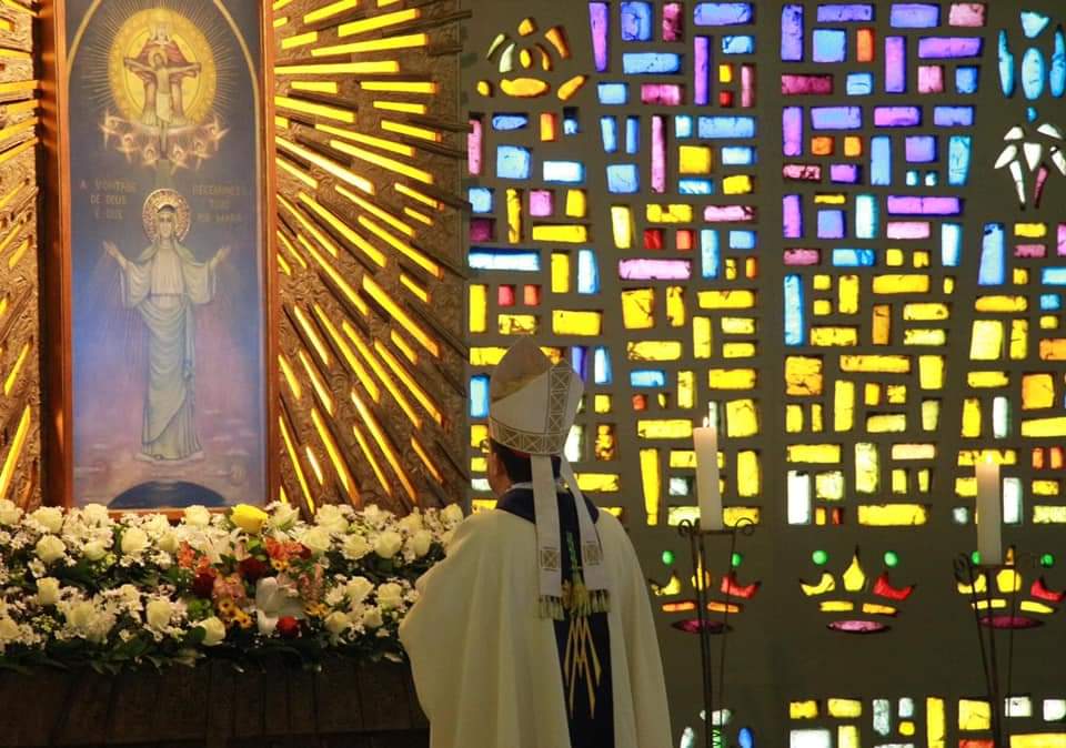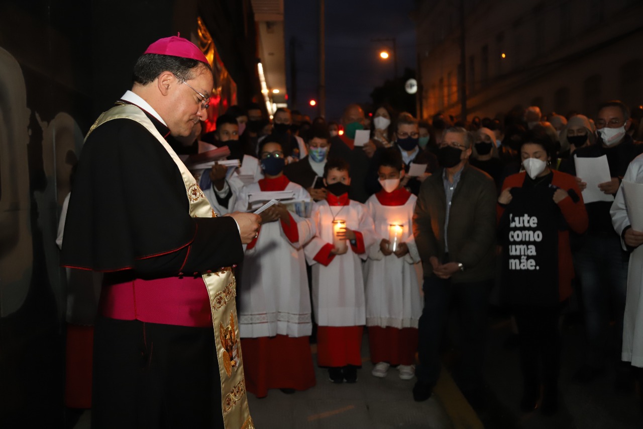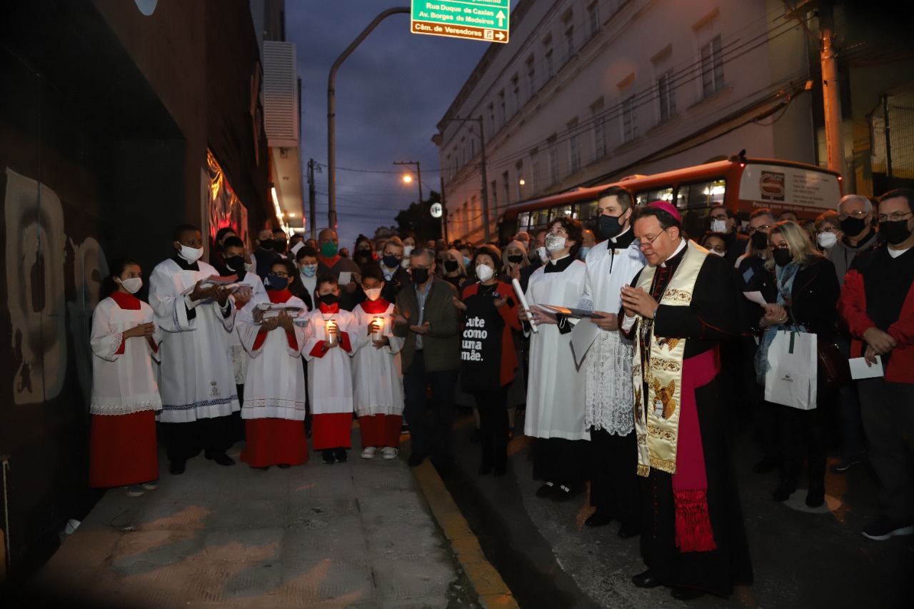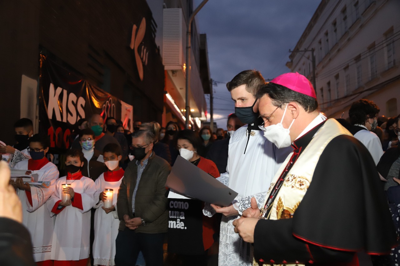 Dom Leomar conclui sua homilia pedindo a intercessão de Santa Maria e se dirigindo ao clero e ao povo de Santa Maria: "enfrentemos juntos os dias luminosos e as noites escuras que virão. Juntos, seremos felizes pois caminharemos unidos, sinodalmente, nas estradas do Senhor. Aqui estou, povo de Deus da Arquidiocese de Santa Maria, sou cristão convosco e para vós eu sou o vosso bispo."