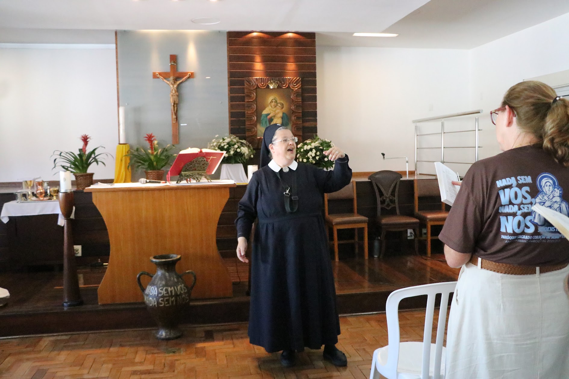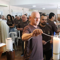 A Ir. M. Eliane Cunha acolheu calorosamente os peregrinos e conduziu os cantos. Após a homilia, os fiéis renovaram as promessas do Batismo e foram aspergidos com água benta — momento em que também foram abençoadas as camisetas conquistadas na preparação para a Aliança de Amor, um dos símbolos que os novos aliados levarão de volta à paróquia.