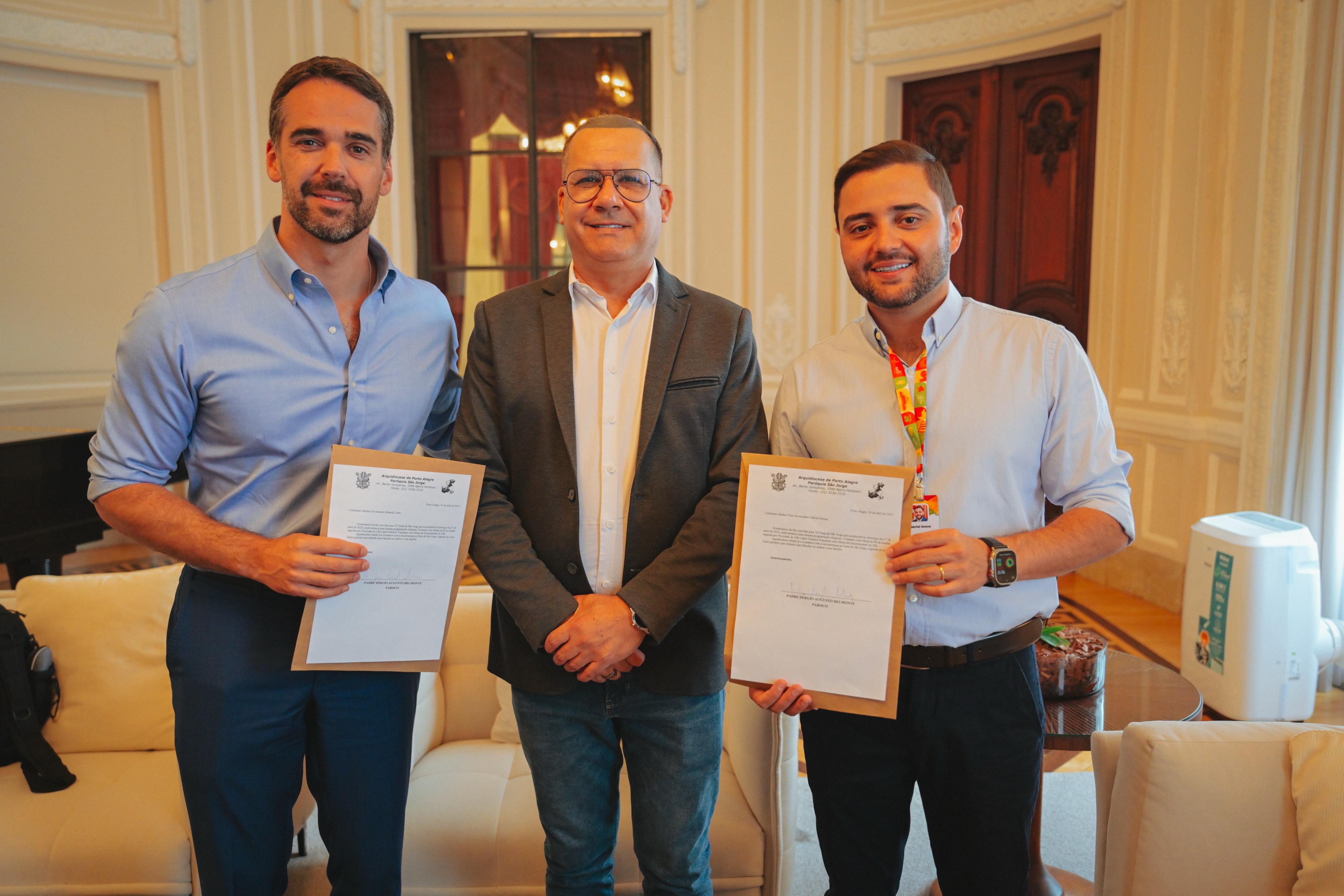 O Governador Eduardo Leite e o Vice-Governador, Gabriel Souza, receberam em audiência na manhã de hoje (24), o pároco da Igreja São Jorge, Pe. Sérgio Belmonte, que fez o convite oficial para a 72° Festa de São Jorge, que segue com as homenagens ao seu padroeiro no dia 27 de abril, próximo domingo, com missa às 9h, seguida da tradicional procissão de São Jorge. A missa de encerramento será celebrada às 20h.