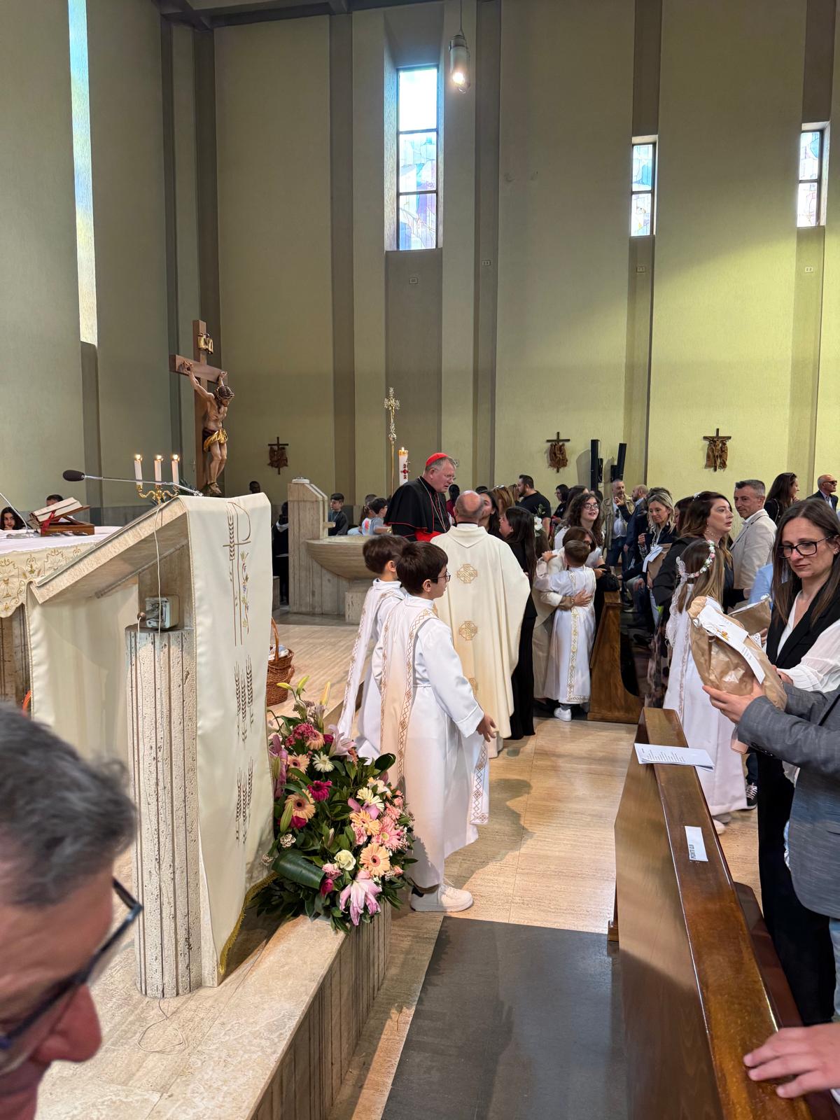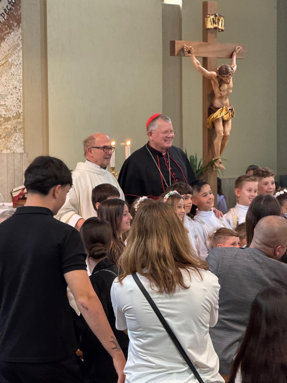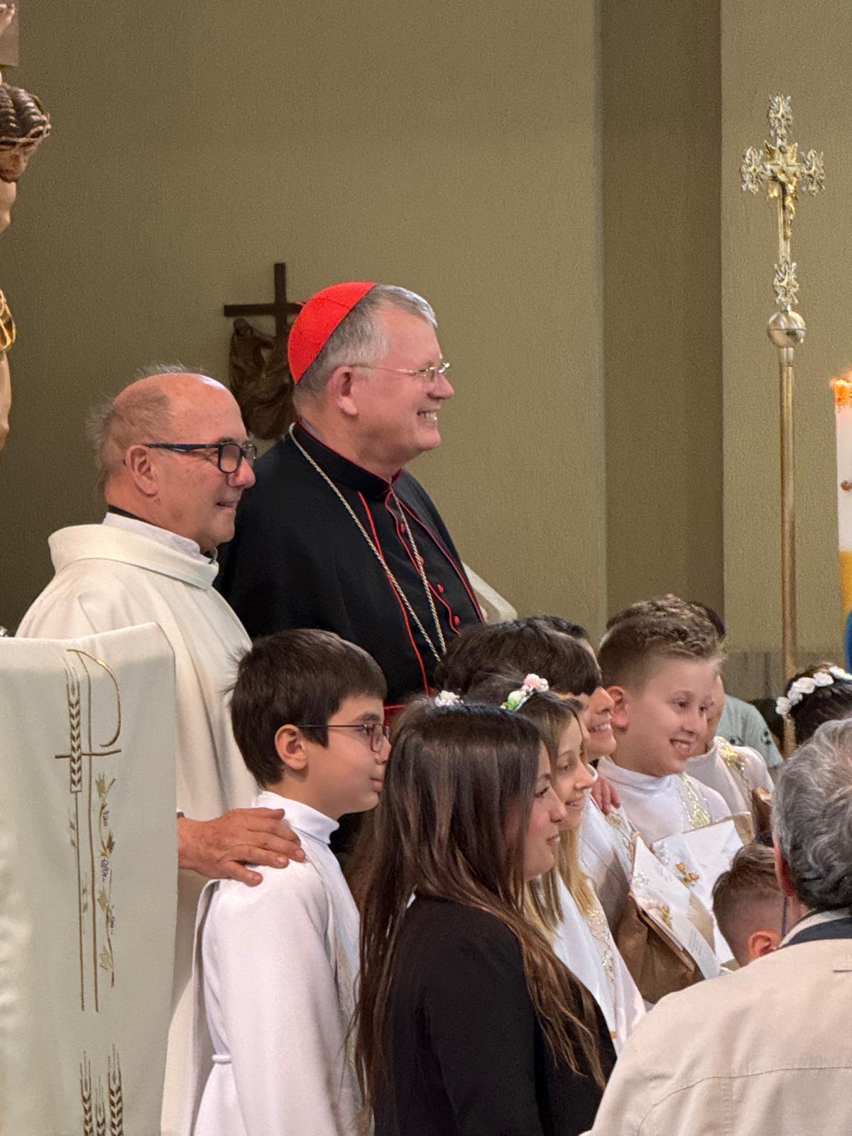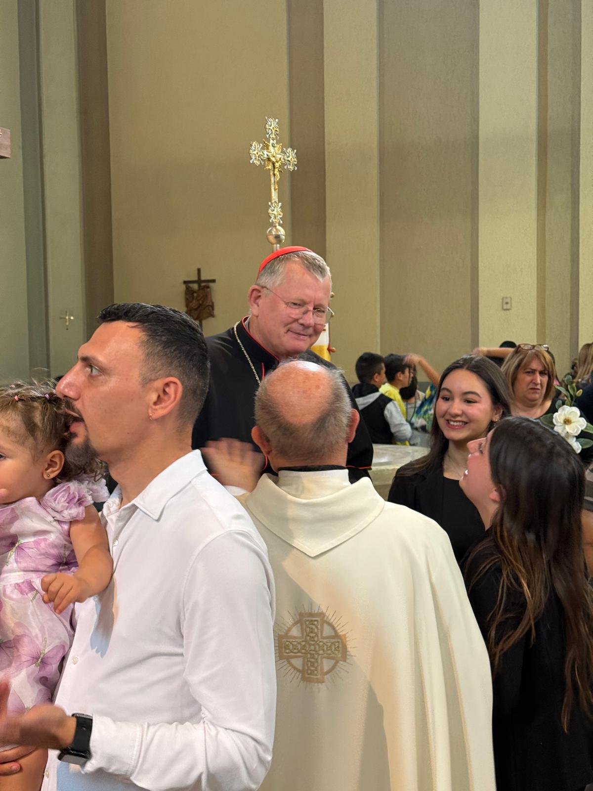 Antes da missa presidida por Dom Jaime, a comunidade paroquial celebrou a Primeira Comunhão de um grupo de crianças. O pároco local, padre Steffano, pediu gentilmente que o cardeal que pudesse tirar fotos com as crianças e seus familiares. Dom Jaime atendeu ao pedido com alegria, demonstrando proximidade e acolhimento, e participou do momento festivo com simplicidade e simpatia.