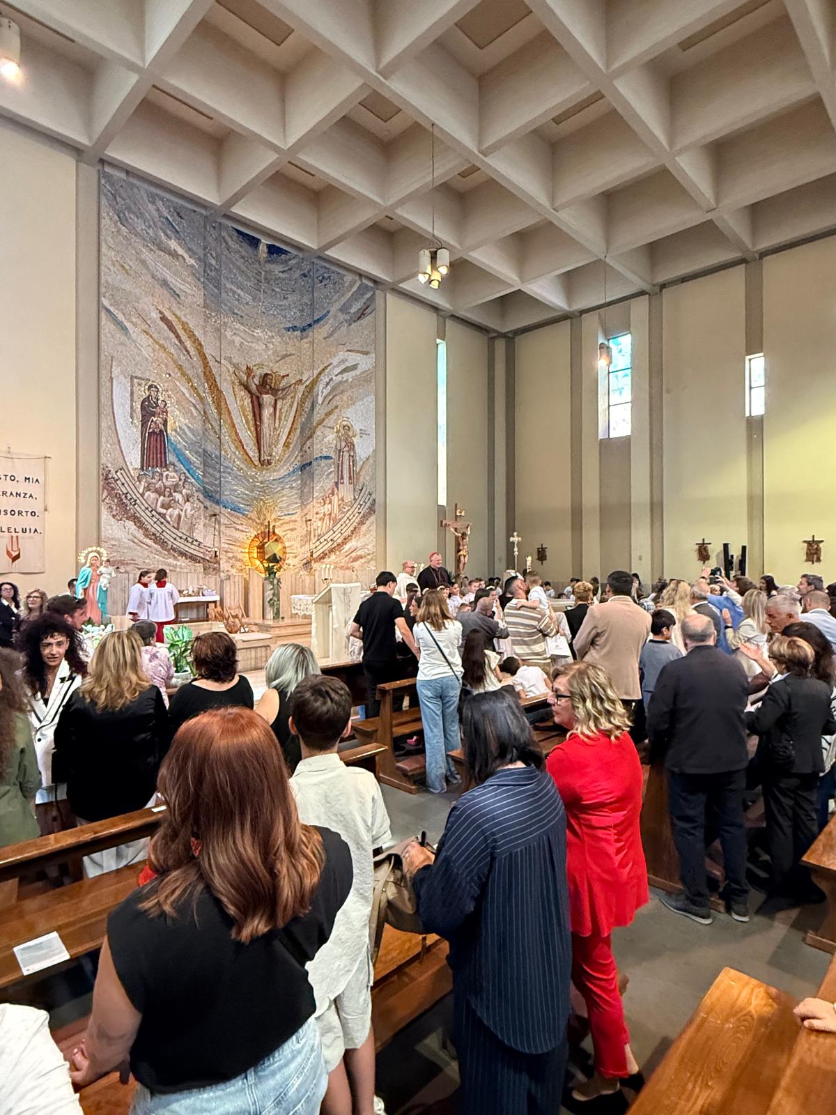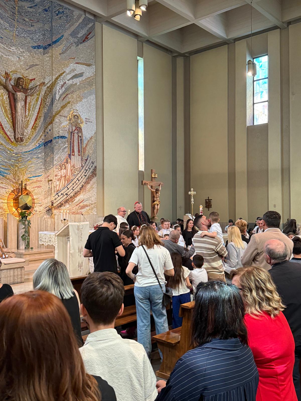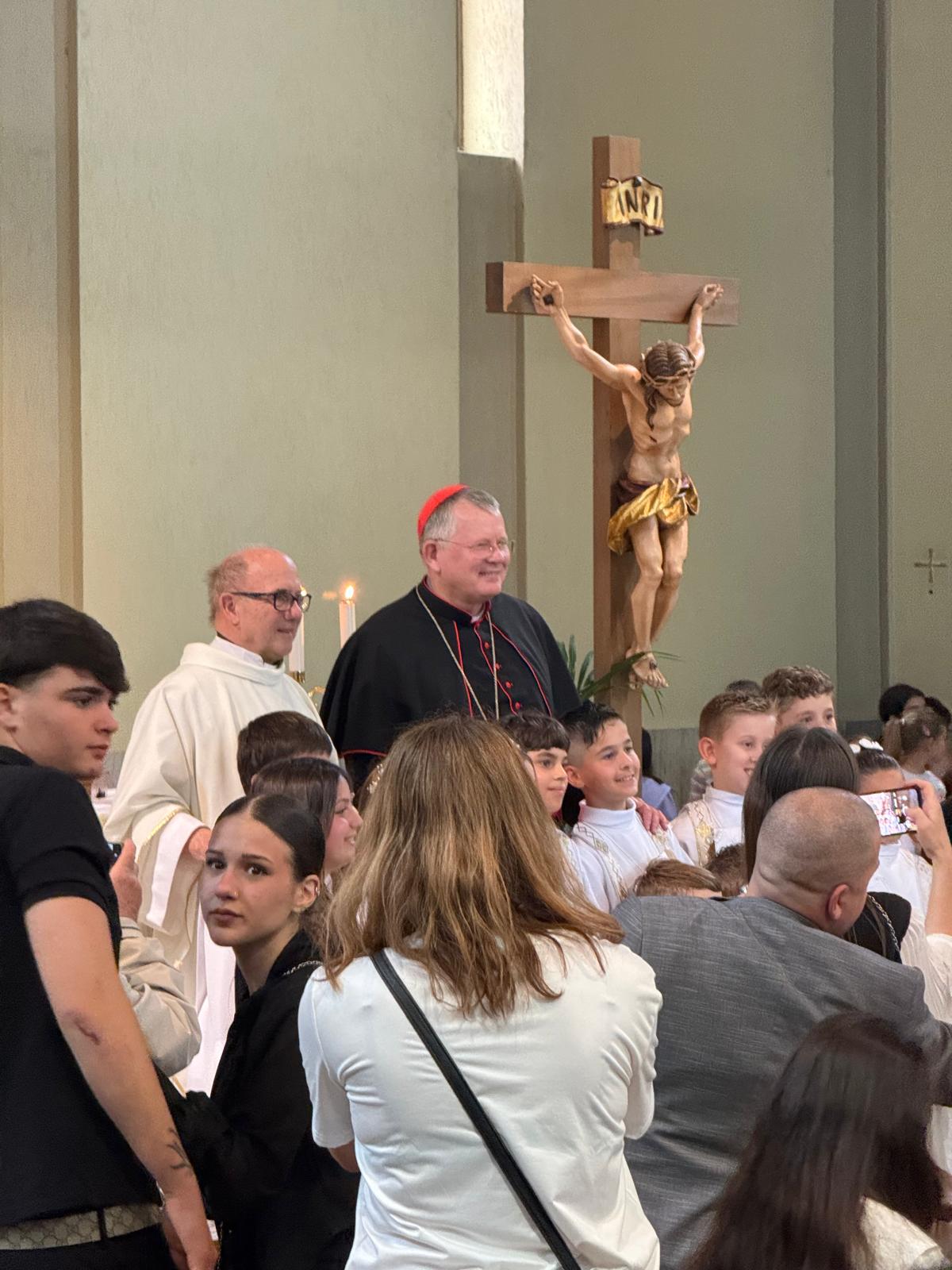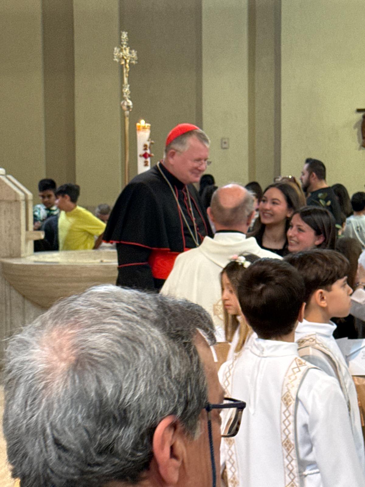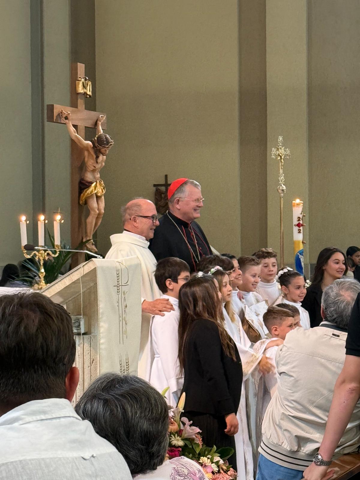 Antes da missa presidida por Dom Jaime, a comunidade paroquial celebrou a Primeira Comunhão de um grupo de crianças. O pároco local, padre Steffano, pediu gentilmente que o cardeal que pudesse tirar fotos com as crianças e seus familiares. Dom Jaime atendeu ao pedido com alegria, demonstrando proximidade e acolhimento, e participou do momento festivo com simplicidade e simpatia.