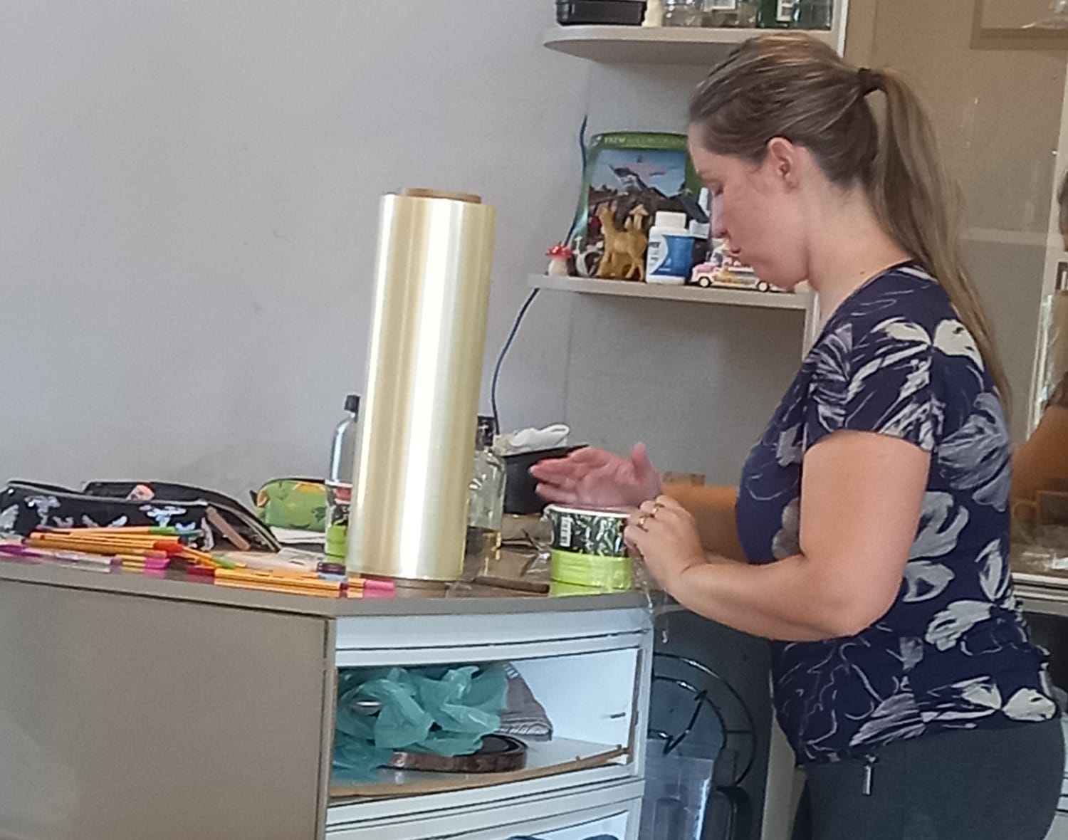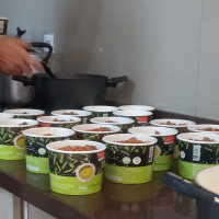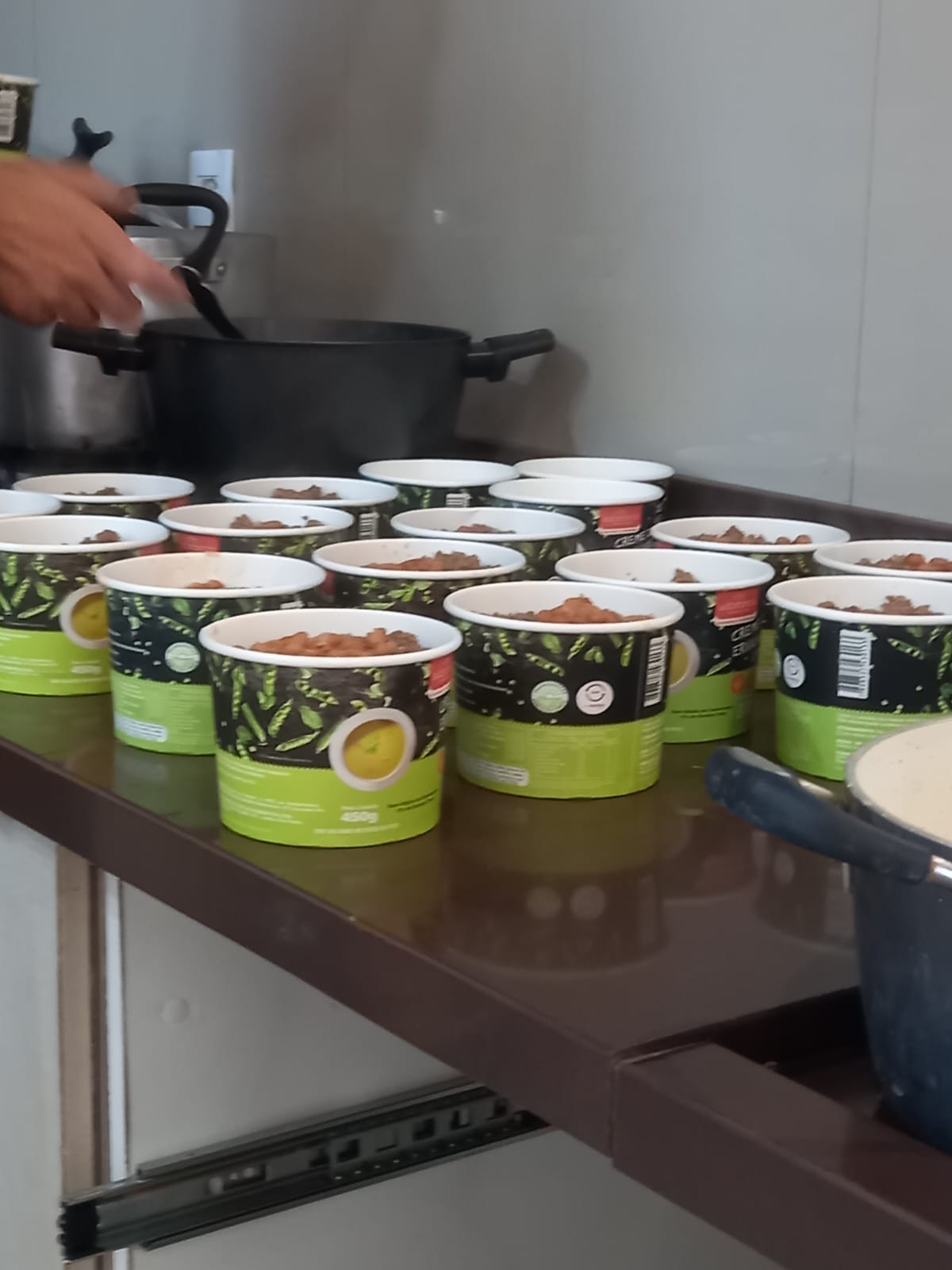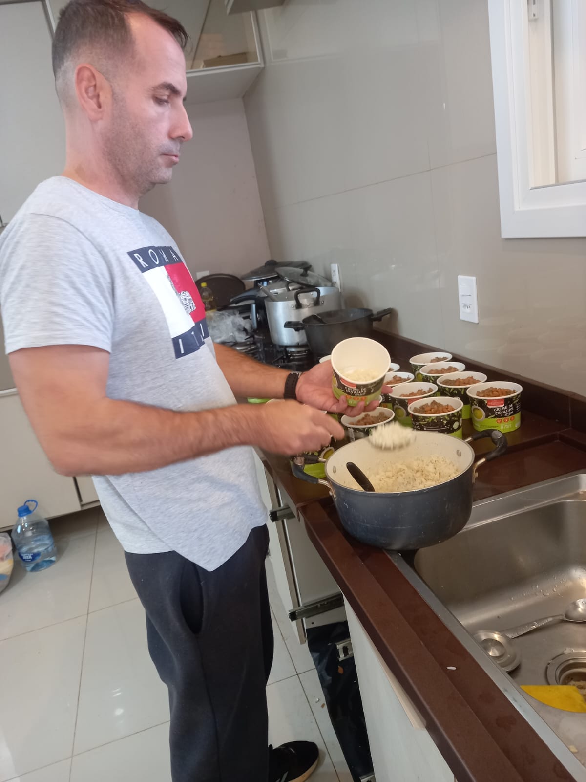 Como nossa casa foi uma das primeiras a baixar a água, em seguida começamos a limpar, minha prima Tatiana Delazeri, conseguia nos fornecer marmitas prontas de Porto Alegre aqui para Eldorado por um tempo, mais depois precisaram entregar a cozinha onde estavam produzindo, porém o pessoal continuou a perguntar sobre marmitas e não tinha como deixar nossos vizinhos sem refeições, com isso começamos a cozinhar com as doações de comida que havíamos recebido e distribuímos aqui na rua, com o aumento do retorno dos vizinhos, aumentou a demanda por marmitas, e os vizinhos começaram a trazer doações para colaborar com as marmitas. Nossa cozinha com fogão simples e apenas uma mesinha auxiliar ficou pequena, então conversei com o Pe.Fabiano Glaeser dos Santos e o coordenador do salão aqui do bairro, que nos cederam a cozinha do salão paroquial. Com isso conseguimos voluntários e hoje tem dias que produzimos 350 marmitas aqui pro bairro.