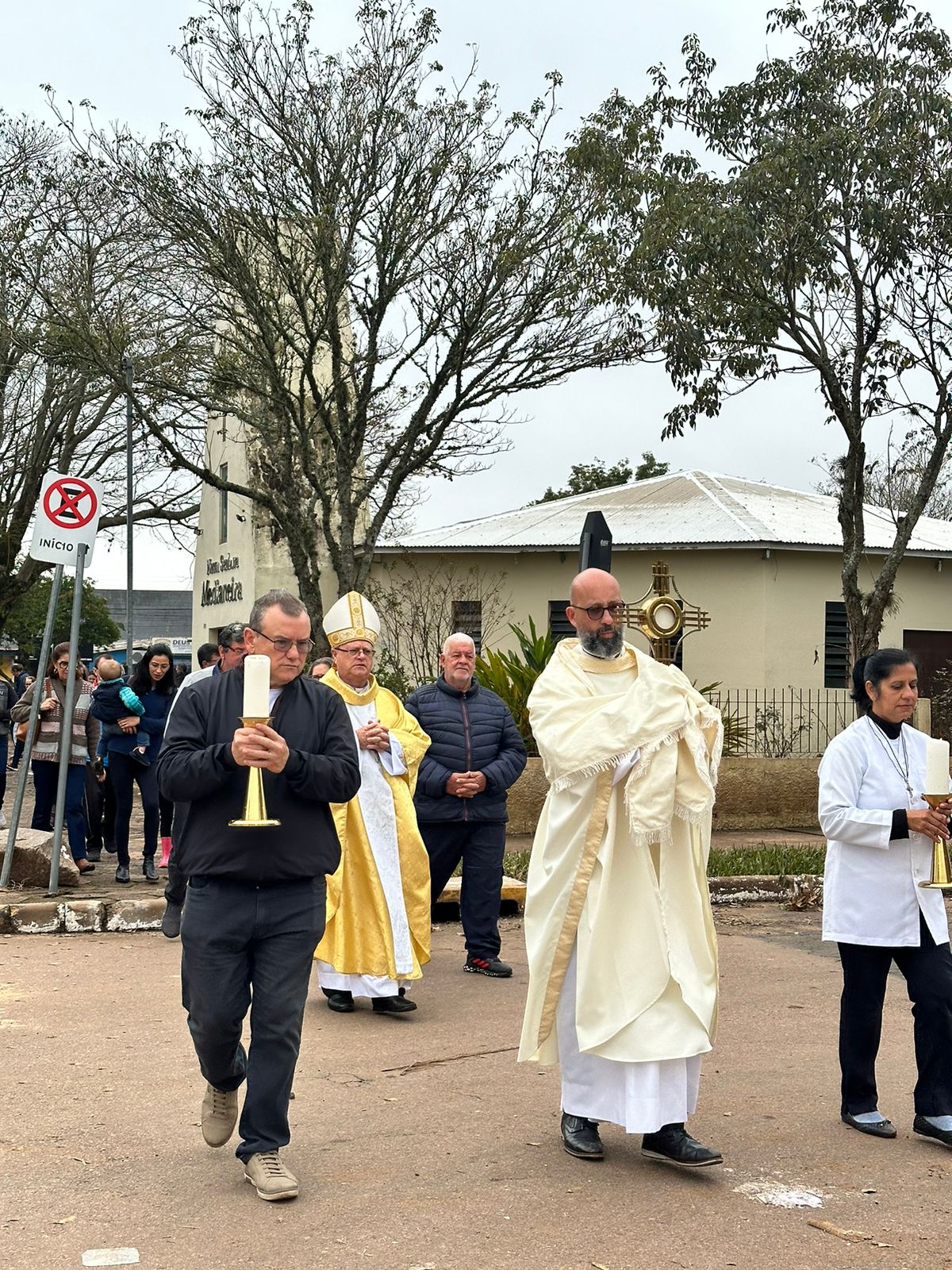 Nós reabrimos a igreja matriz de Eldorado do Sul. Rezamos a primeira missa. Ainda muito improvisado porque nós perdemos os microfones, perdemos materiais de missa.