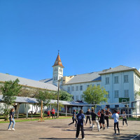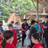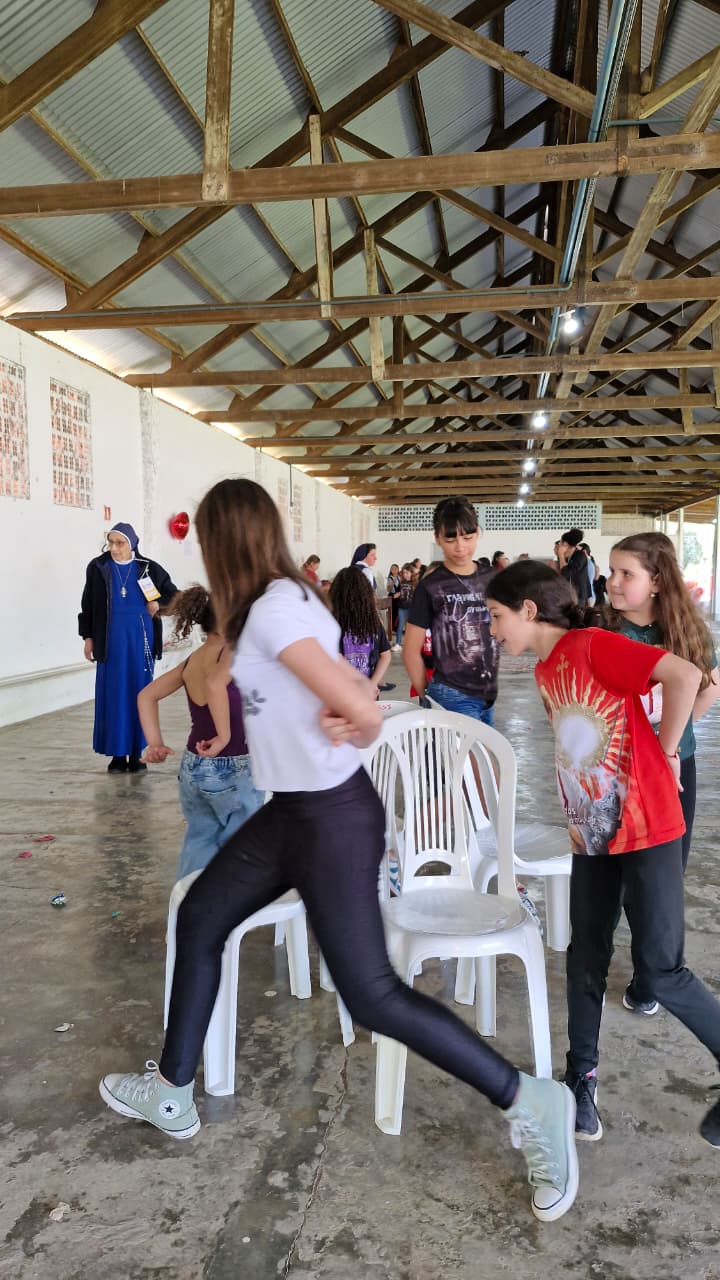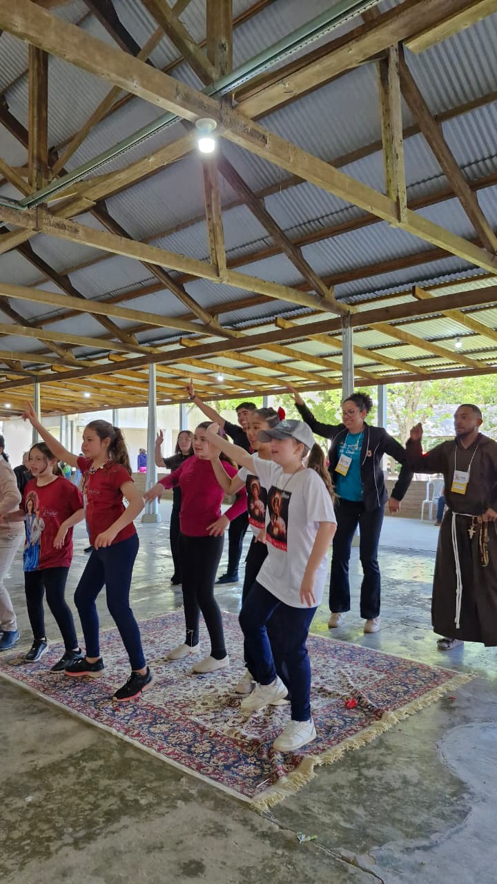 Após a celebração, o encontro seguiu com três atividades formativas simultâneas. As crianças assistiram a uma peça teatral no pavilhão, os acólitos mais velhos participaram de uma formação específica na Capela Central, e os assessores e catequistas tiveram um momento de troca de experiências no auditório.