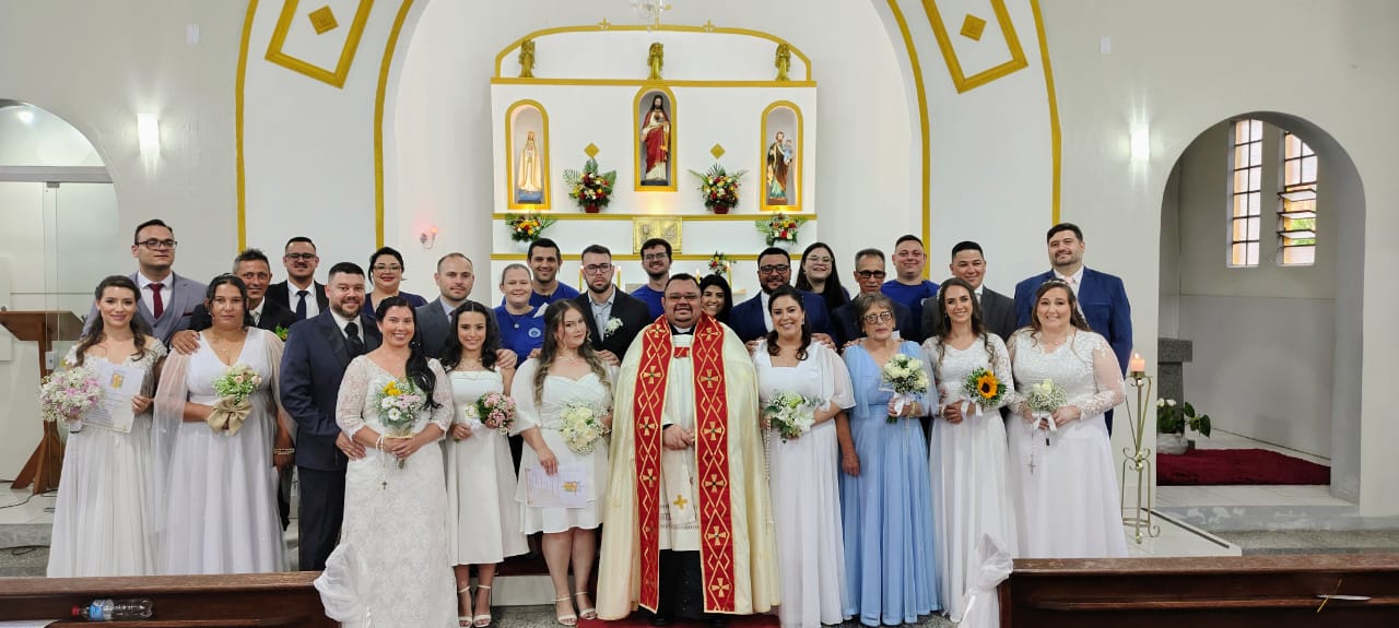 Os casais, que já conviviam há algum tempo, participaram do Itinerário de Preparação para o Sacramento do Matrimônio proposto pela Arquidiocese de Porto Alegre. A formação, conduzida pela Pastoral Familiar da paróquia, teve como objetivo aprofundar a compreensão do matrimônio como vocação e sacramento, integrando plenamente os noivos à vida eclesial.
