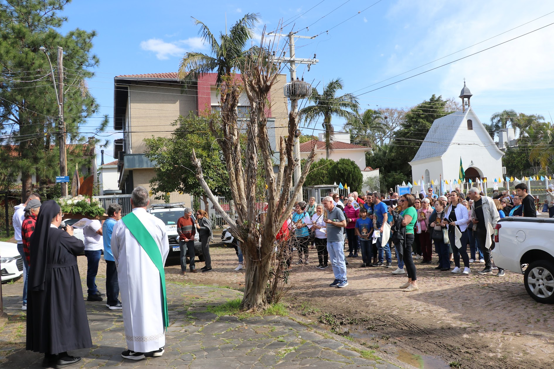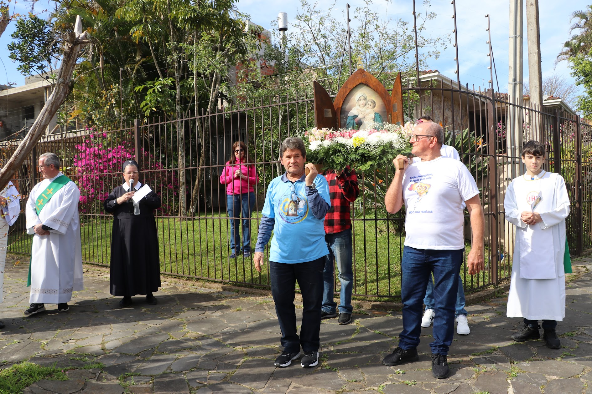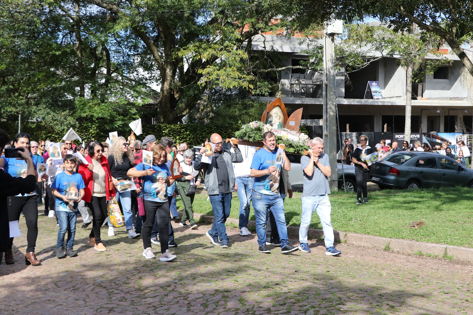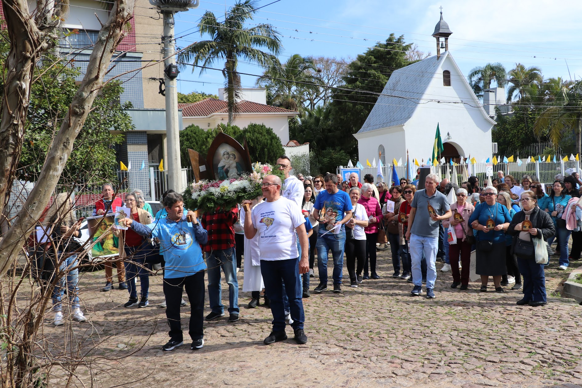 A celebração também foi marcada pela renovação da coroação da Mãe Peregrina Auxiliar, gesto de profunda devoção e compromisso missionário. Neste ano, a coroa recebeu uma pedra preciosa, oferecida em gratidão por uma graça alcançada pela família de Victória Beis Nahas, seu esposo, Roberto Bortoncello, e sua avó, Leila Bortoncello, integrante da Liga de Mães de Schoenstatt. Dom Juarez coroou a Mãe Peregrina Auxiliar da Arquidiocese de Porto Alegre enquanto os fiéis entoavam a música: Eis, ó Mãe recebe a coroa! O encerramento se deu com a oração da novena de João Pozzobon e a bênção das sementes, uma tradição da festa e bênção dos objetos de devoção e bênção final.