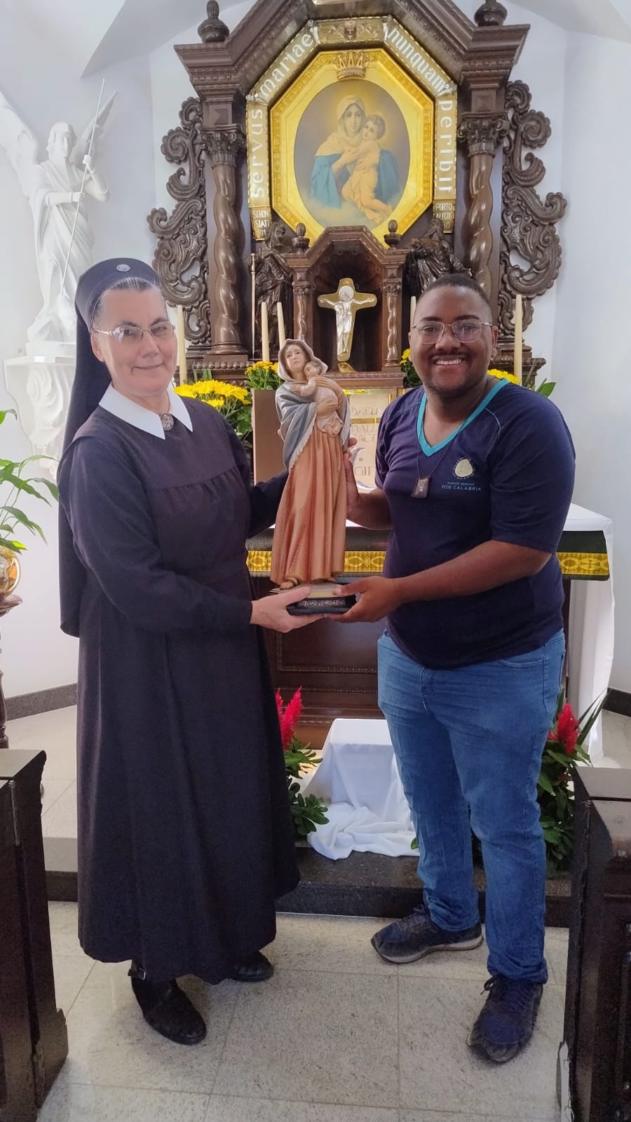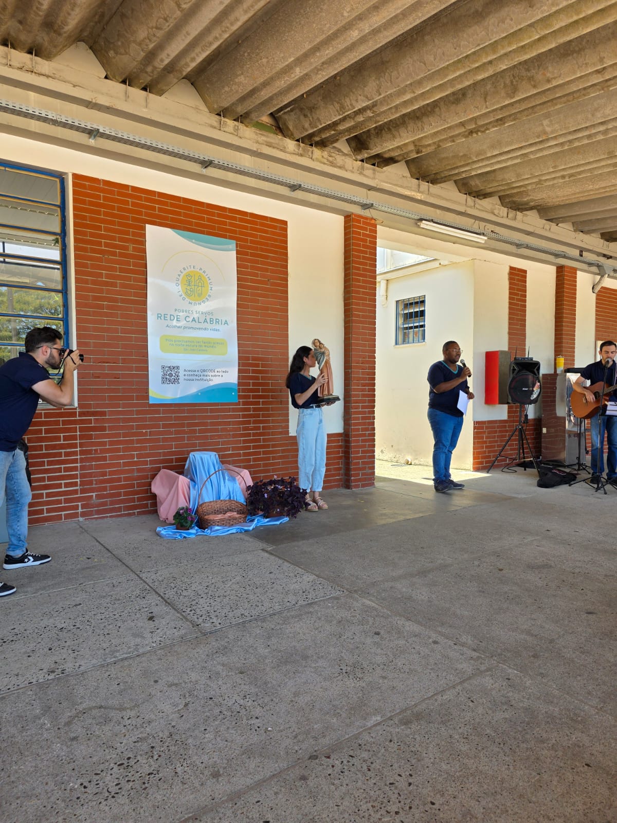Durante a recepção, colaboradores da instituição se reuniram em oração e depositaram seus pedidos de bênçãos aos pés da Mãe da Obra, confiando a Maria suas intenções pessoais, familiares e profissionais. O gesto simbolizou a entrega do caminhar da comunidade educativa à proteção materna de Nossa Senhora, reforçando a vivência da fé no cotidiano da missão calabriana.