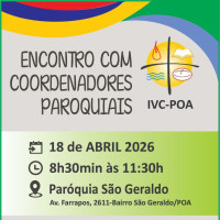 A Arquidiocese de Porto Alegre promove, neste sábado, 18 de abril, o Encontro com Coordenadores Paroquiais da Iniciação à Vida Cristã (IVC). A atividade ocorre das 8h30 às 11h30, na Paróquia São Geraldo, reunindo representantes dos vicariatos para...